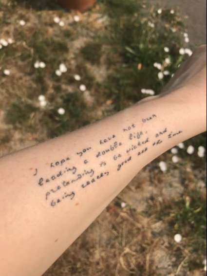He passed away on June 5. On July 5, I got my very first tattoo to honor him. Since his name was Oscar Wilde, a quote seemed fitting. So this is from the play ‘The Importance of Being Earnest,’ and it is written in a font based on the original Oscar Wilde’s own handwriting. In case you have difficulty reading it, it says, ‘I hope you have not been leading a double life, pretending to be wicked and being really good all the time.’